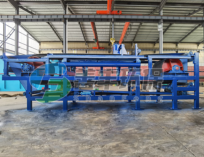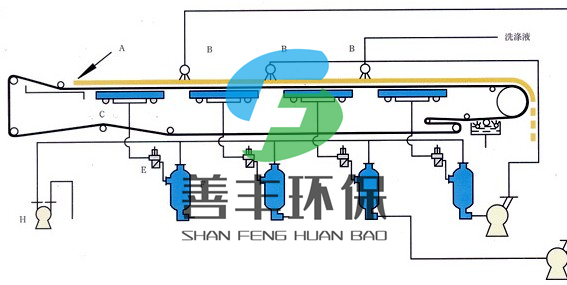 料漿由進(jìn)料裝置均布在向前移動(dòng)的濾布上,在真空泵的抽濾作用下,濾液穿過(guò)過(guò)濾布和膠帶過(guò)濾孔進(jìn)入真空箱,再?gòu)恼婵障湎虏康倪B接管道進(jìn)入濾液罐,固相截留在濾布上形成濾餅。由于重力和真空抽力方向一致,沉降時(shí)較大顆粒沉在濾餅之下,小顆粒沉在濾餅之上,形成結(jié)構(gòu)合理的助濾層,其阻力小。過(guò)濾速度高。所形成的濾餅隨膠帶而移動(dòng)被多次洗滌,脫水,然后在濾布轉(zhuǎn)向處脫落。其后,濾布和膠帶經(jīng)過(guò)驅(qū)動(dòng)轘分開(kāi),分別用高壓水清洗再生,濾布經(jīng)過(guò)糾偏裝置調(diào)整后,重新回到進(jìn)料端開(kāi)始新的作業(yè)循環(huán)。