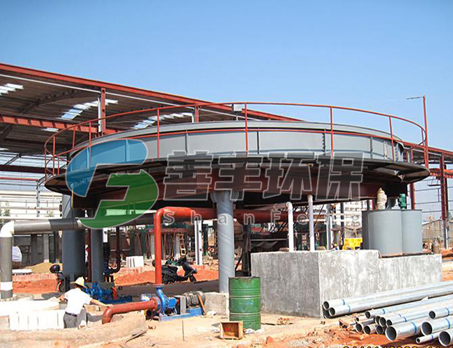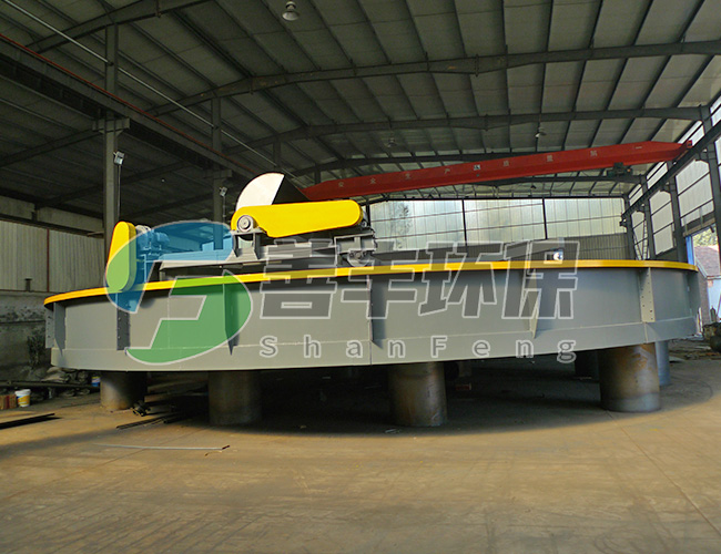 該設備整體呈圓柱形,結構緊湊,池子較淺。包含池體、螺旋布水機構、溶氣釋放機構、旋轉機架、集水機構,撇渣機構、溶氣系統、回流水管道及電控柜等部件。進水口,出水口和污泥的排出口均在設備的旋轉區域內,布水機構、集水機構、溶氣釋放機構都與框架緊密連接在一起,圍繞池體中心轉動。本裝置提供成套設備總成及控制系統,通過集中控制與分散控制相結合,以使設備達到更好運行狀態。
