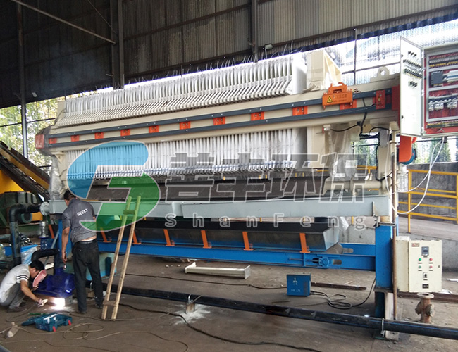 懸浮液用料泵送入濾機每個密閉的濾室,在壓力作用下,濾液透過濾層及濾布,經濾布出液口排出,濾渣則留在濾框內,從而達到固液分離的目的。